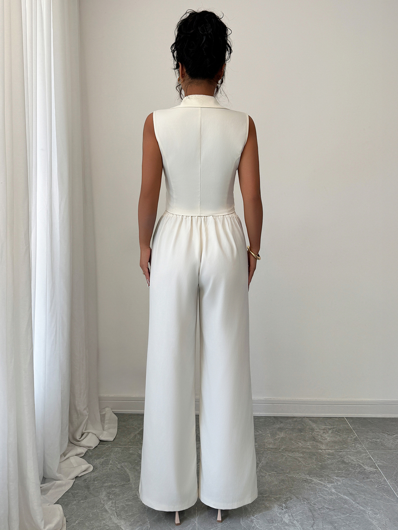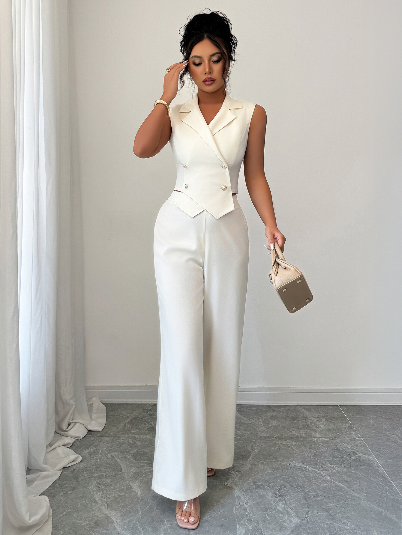 Elegant Waist-cinching Top Paired With A Flowy Wide-leg Pantsuit